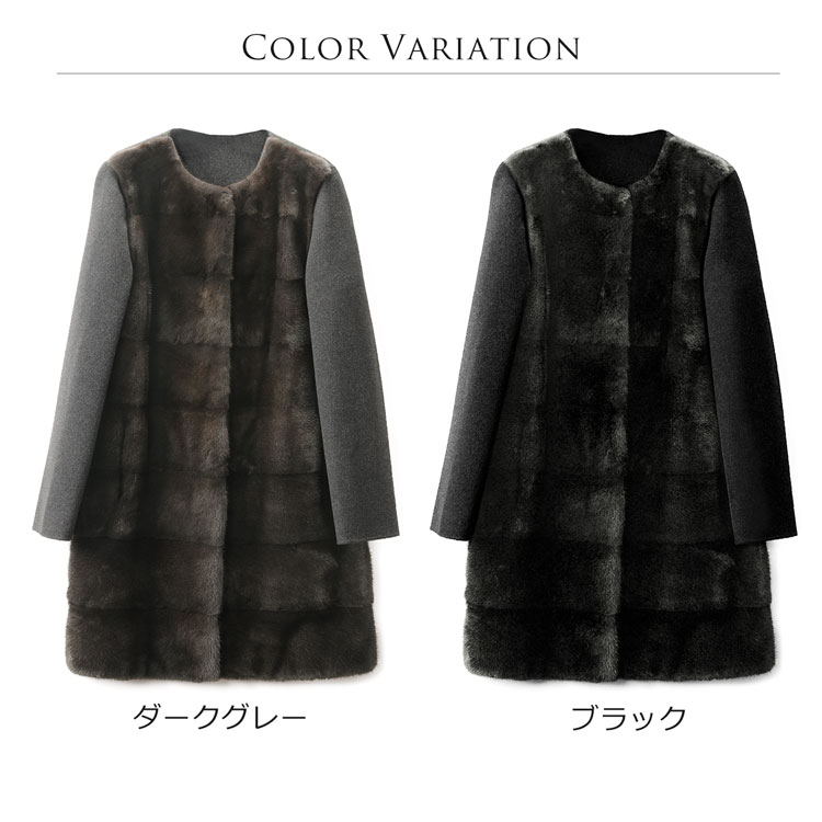 素材表地:ウール60%、カシミヤ40%裏地:シルク100%毛皮:ミンク(ブラックの表地はウール90%、カシミヤ10%を使用しています。