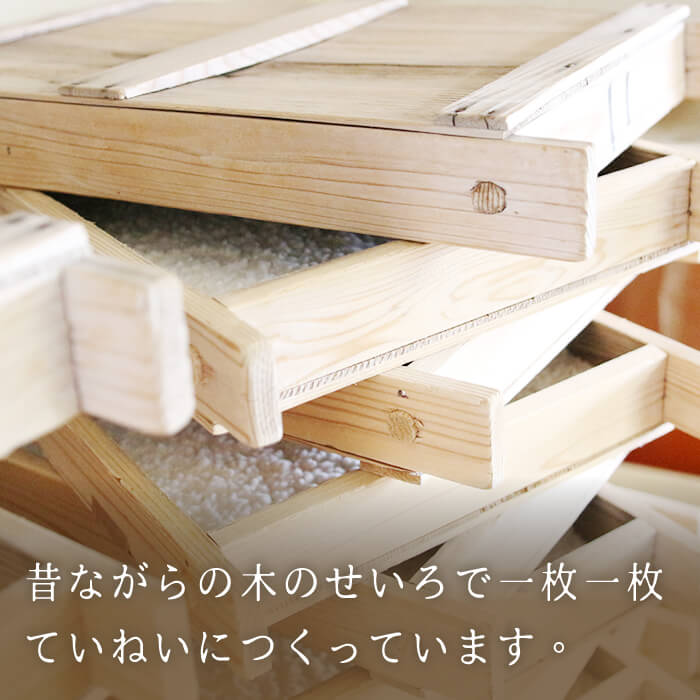 この米麹は四角い蒸篭(せいろ)で温度管理を徹底して、さら蒸籠の上と下で出来上がりの差をなくすために入れ替えながら互い違いにして均等に米麹を作る伝統の手法です。
