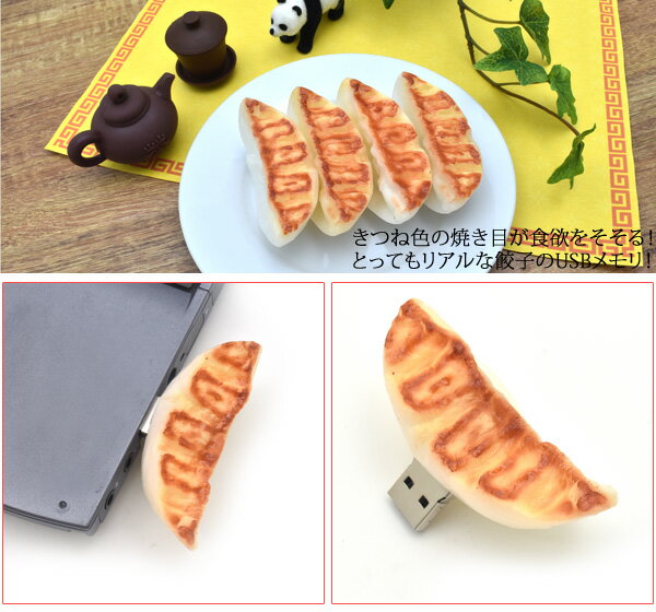 見てるだけで楽しいおもしろUSBメモリ!焼き餃子タイプ! きつね色の焼き目が食欲をそそる餃子の形をしたUSBメモリです! 質感もとってもリアル!思わずかじってしまいそうです! 画像や音楽などたっぷり入る大容量8GB!また高速USB2.0転送です。